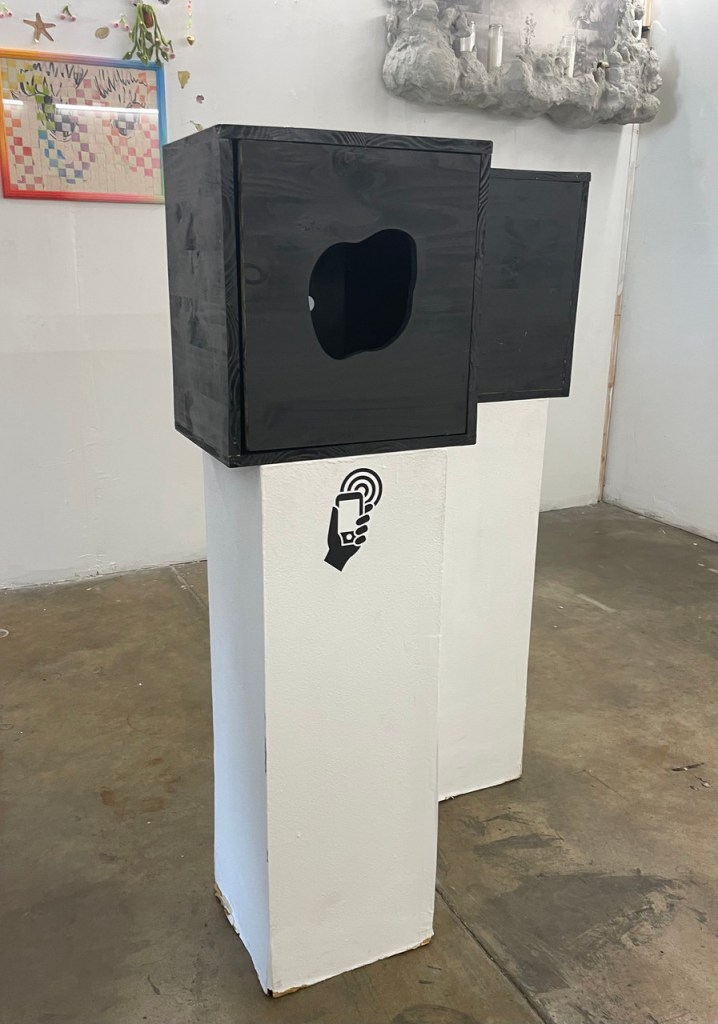 exploring the idea of past, present, and future glory holes. Gallery patrons are to hold their phone inside the box momentarily, which will trigger the NFC Tag inside the box. The NFC Tag will automatically open the default browser and take the user to a self hosted GIF that uses distorted and AI generated images of humans to imitate the often scrolled ‘made just for you’ grid of fellow users on dating and hookup apps.