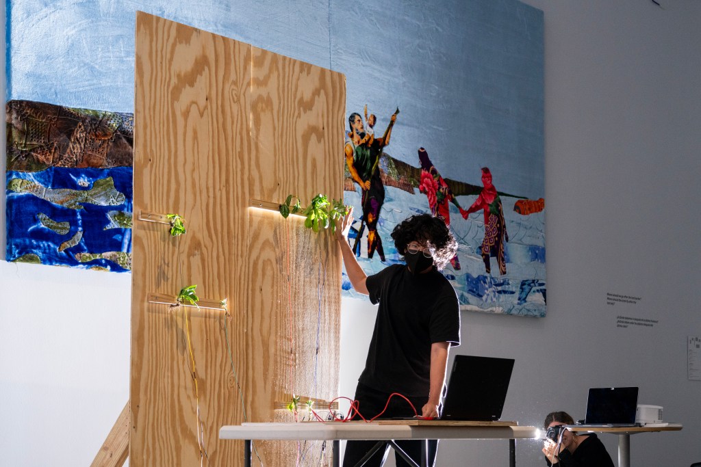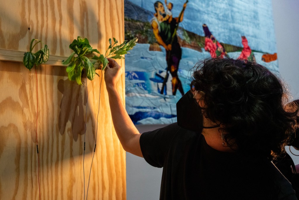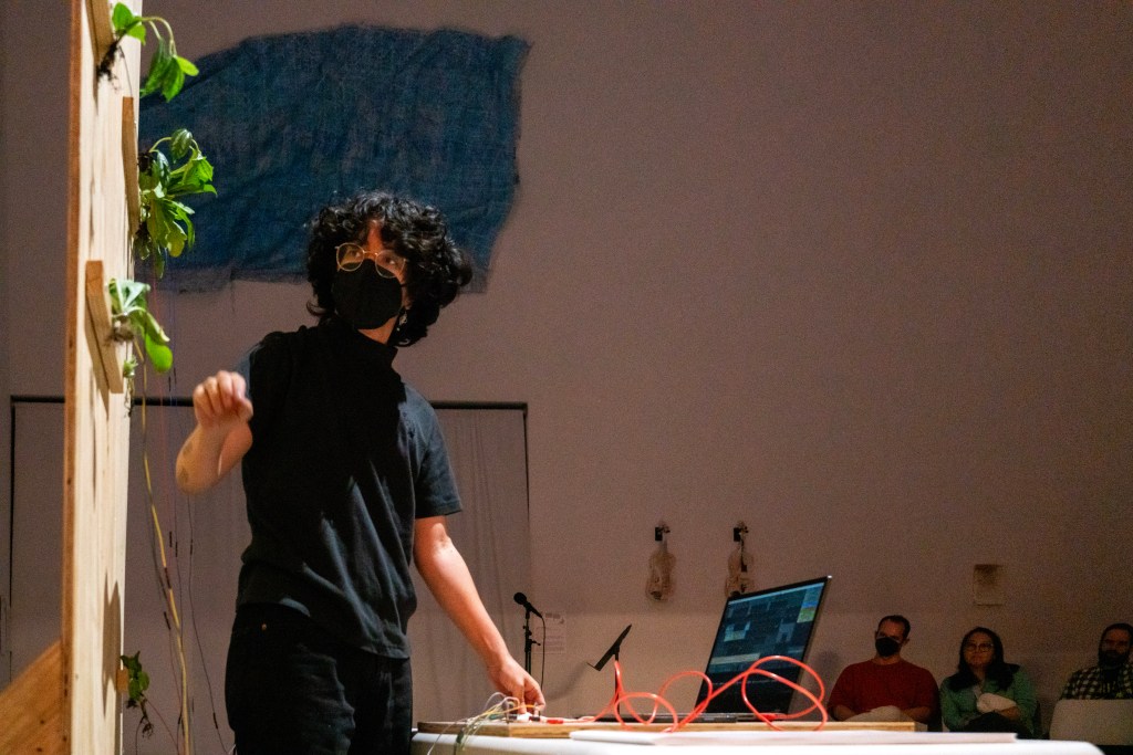 Rhizome focuses on a speculative future, in which language has evolved past tongues, and humans, flower, and fauna, live in a symbiotic relationship against those whose greed threatens to destroy the earth. The artist uses the electricity present in all living things, to speak (metaphorically) to the audience. Each plant is wired to a chip attached to a computer that reads each closed circuit every time the artist touches one of the plants, and triggers the audio of a pre-recorded sound file to play. The voices of the plants tell the story of the future earth, over and over until the voices are an unrecognizable cacophony. All parts of this work were authored, written, recorded, and edited by the artist.